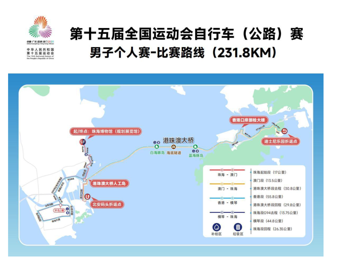 本次公路自行车男子个人赛赛程231.8公里,分为四段——香港段55.8公里、澳门段13.5公里、珠海段117.7公里、横琴段44.8公里,选手6次穿越三地口岸,全程无间断骑行。这场赛事创下了全运会史上赛道最长、跨境次数最多的纪录。